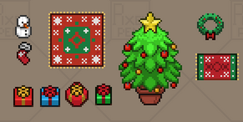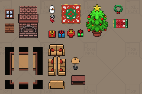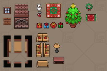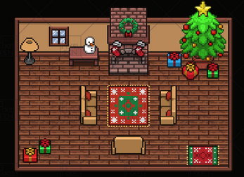 A modular pixel art winter room, perfect for RPGs, visual novels, and slice-of-life games. Includes a decorated fireplace, Christmas tree, snowy window, and festive furniture. Designed for 16x16 interiors.